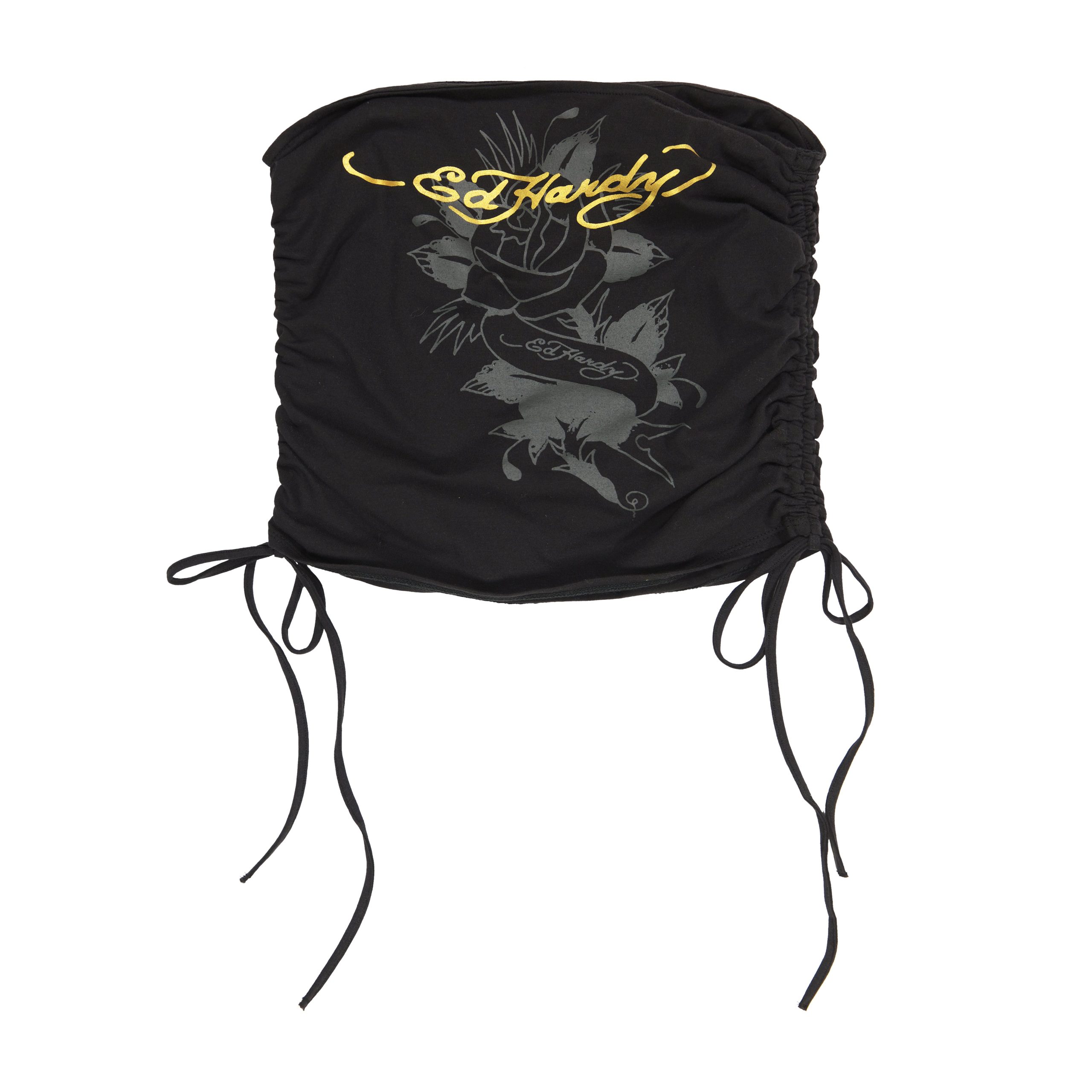 Adjustable gathered tube top constructed from an ivory cotton-blend. Features layered archival Ed Hardy graphics and a gold logo. Pair with Swallow Booty Biker Short to complete your look.