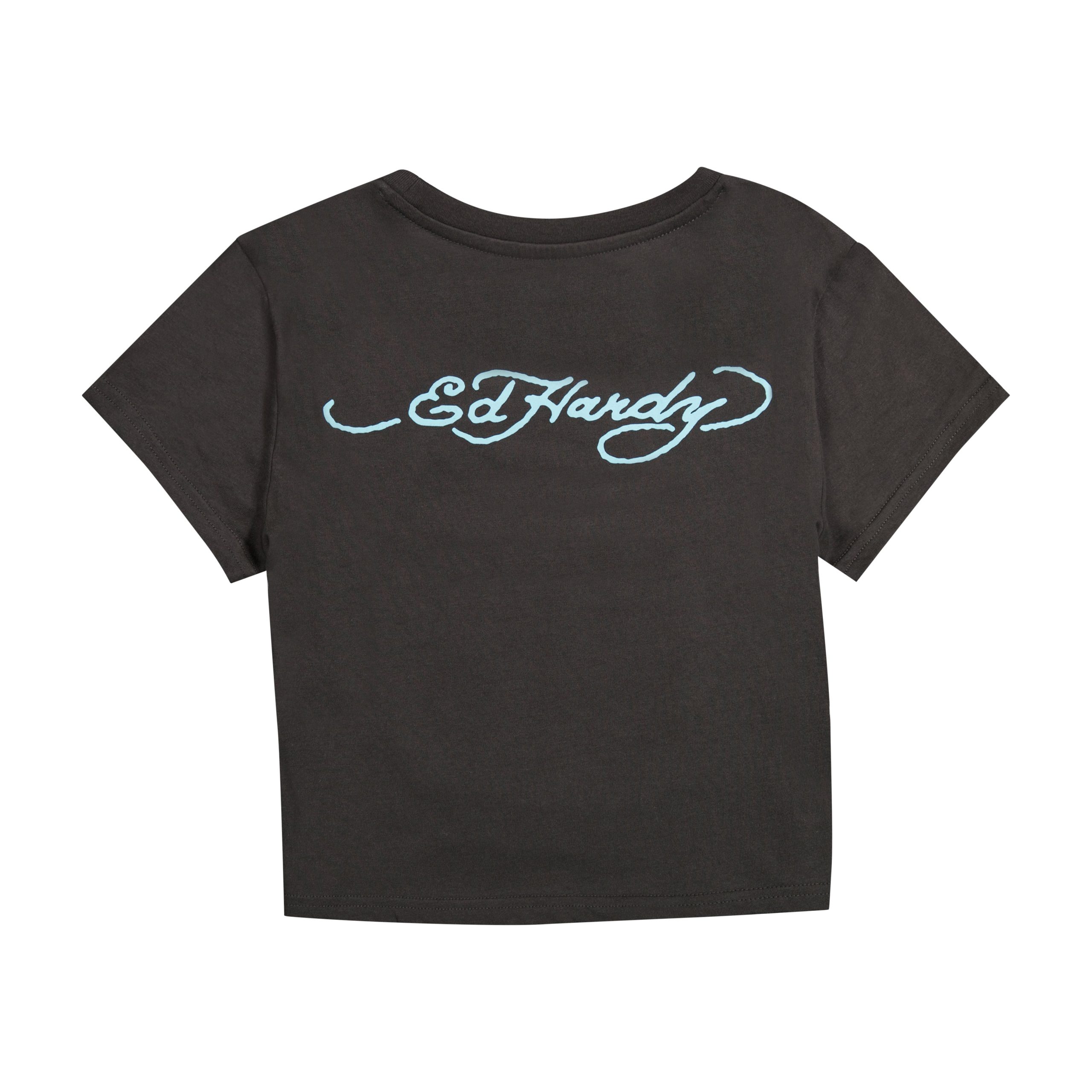 Our classic baby tee silhouette featuring a rhinestone rose cobra graphic and blue Ed Hardy logos. Constructed from a soft cotton blend.