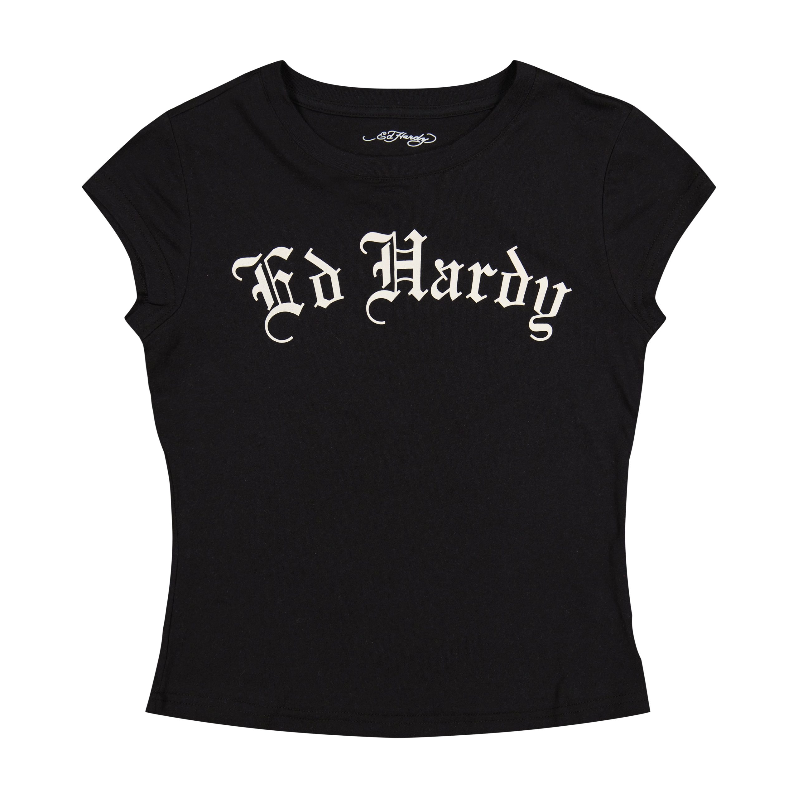 Cap sleeve fitted tee cropped at the waist. Complete with an archival cross heart graphic and an old English Ed Hardy logo.