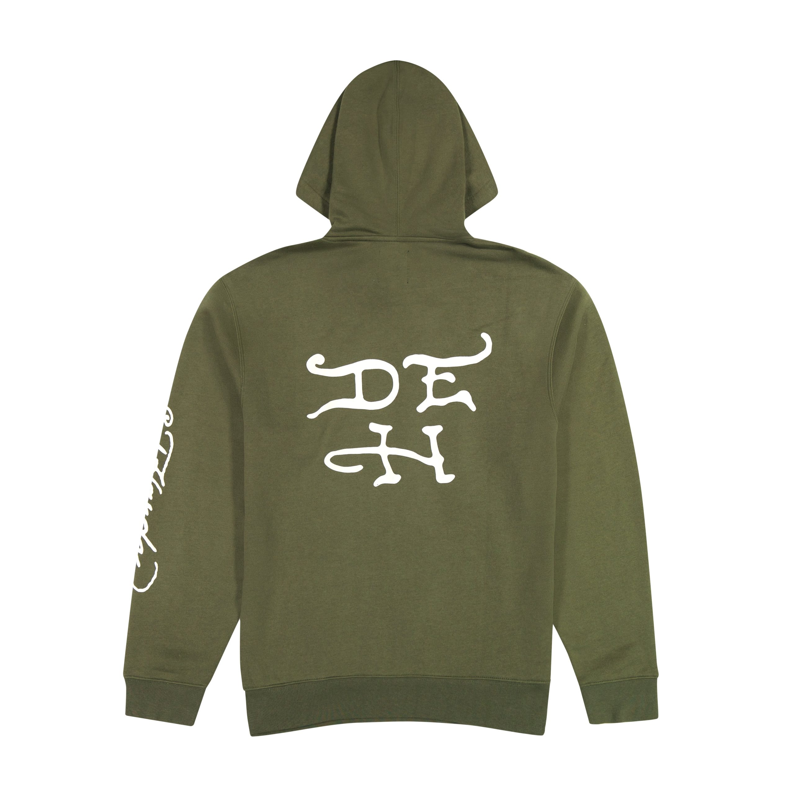 This olive hoodie features a classic pullover silhouette. layered archival artwork. and three iconic Ed Hardy logos.