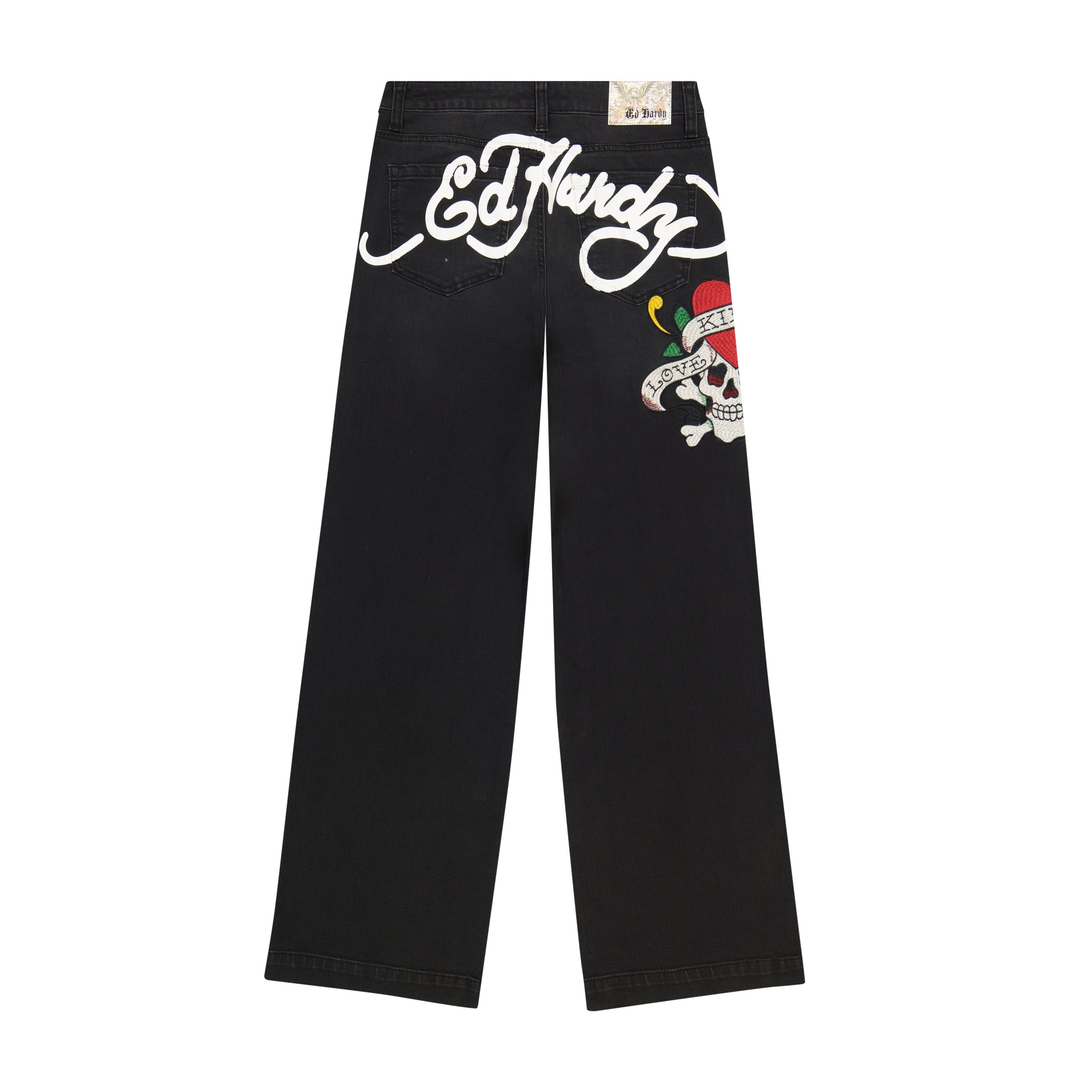 Embrace Y2K fashion nostalgia with Ed Hardy Denim. These faded black jeans feature a wide leg fit. classic cotton fabrication. and a love kills slowly heart skull graphic.