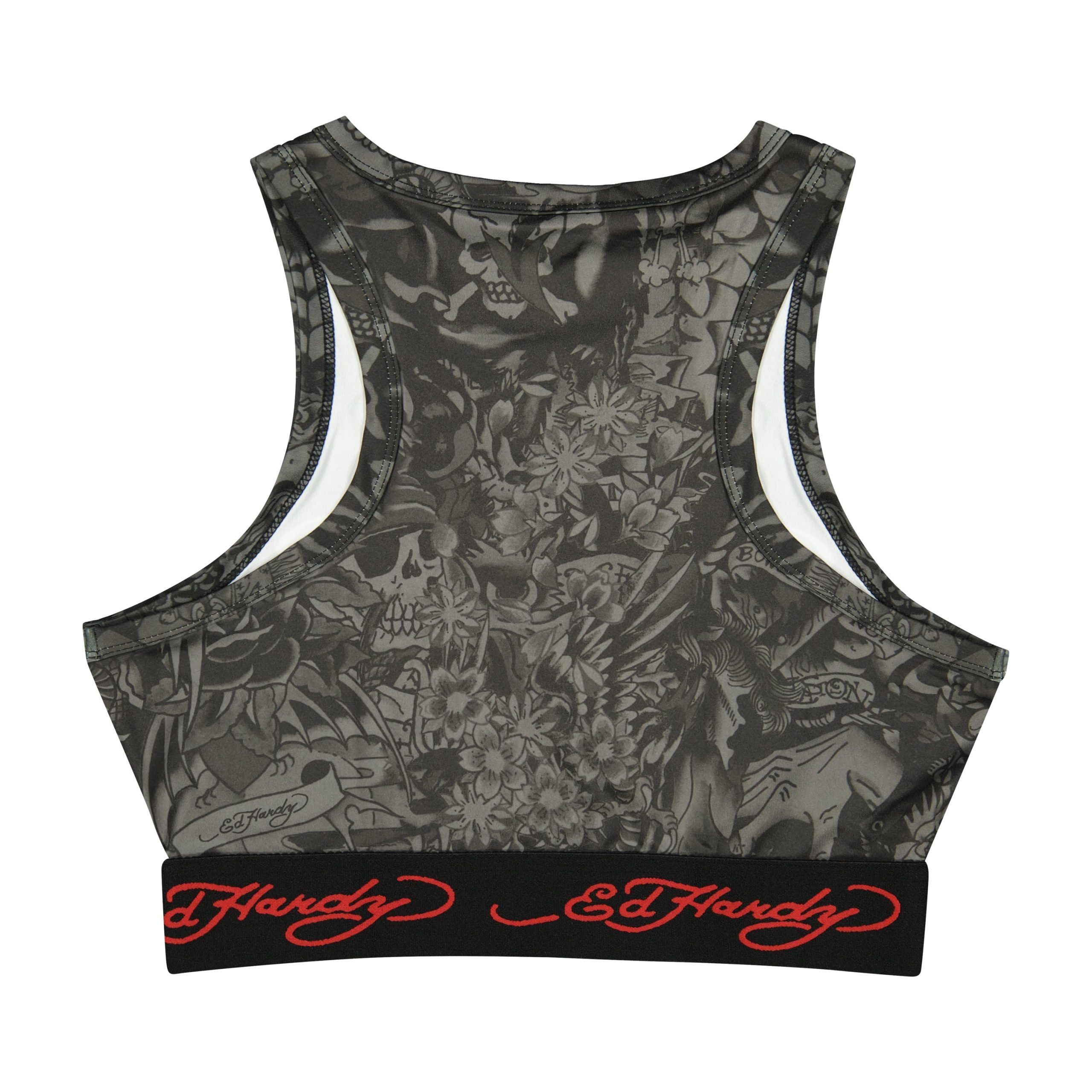 Sport tank cut from a sleek and flattering poly-spandex blend in an Ed Hardy tattoo collage print and Old English logo. Features a stretch waistband and complete with a signature Ed Hardy logo in red.
